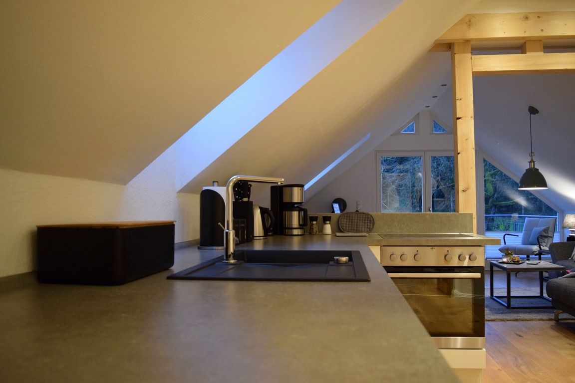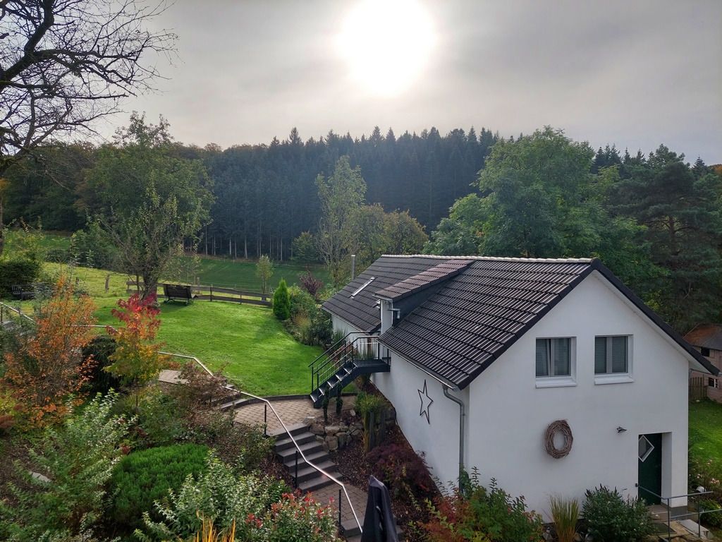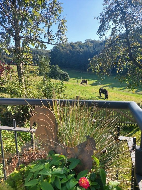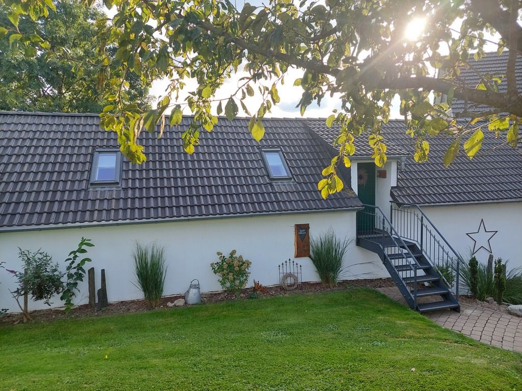 Unsere im September 2017 fertiggestellte Ferienwohnung "Auf´m Hühnerstall" befindet sich im Dachgeschoss eines kleinen separaten Nebengebäudes im Garten. Durch die Hanglage ist die Wohnung über eine kleine Treppe im Außenbereich erreichbar. Der 9m2 große Balkon mit Süd-Ost-Ausrichtung gewährt einen freien Blick auf Wiesen und Wälder und auf unsere Mini-Hängebauchschweine merle & Rüdiger. Die beiden haben Ihren Stall nämlich direkt unter der Ferienwohnung mit freiem Zugang zur angrenzenden Weide.