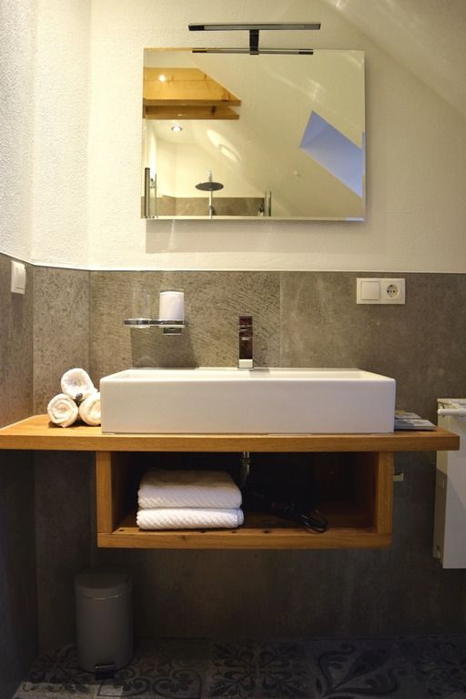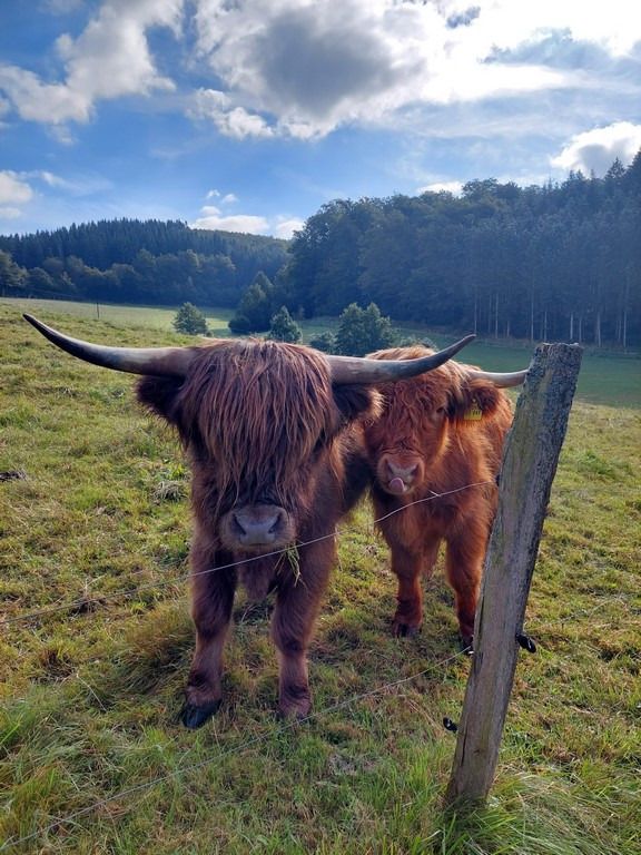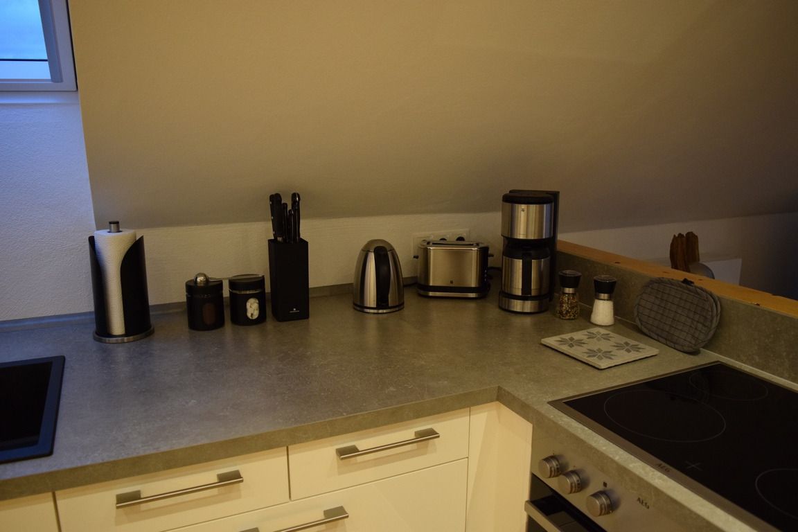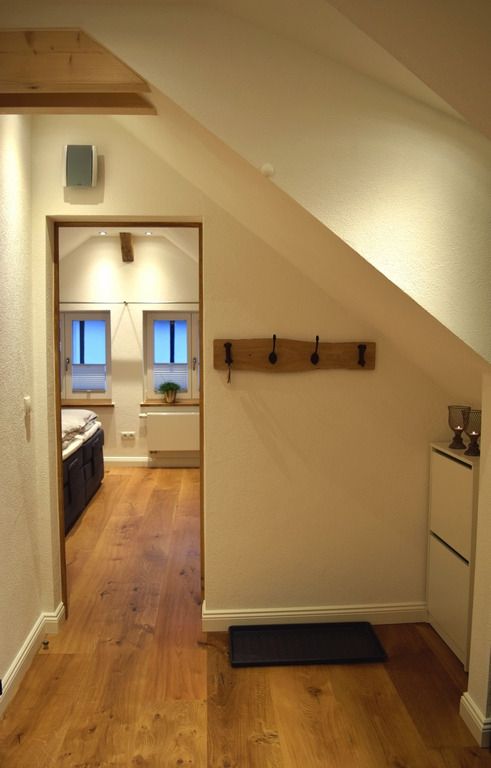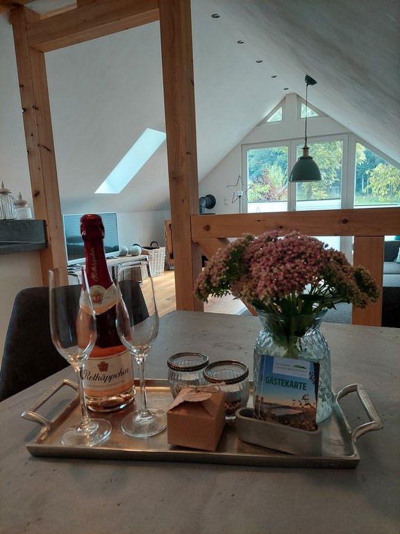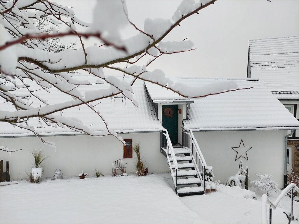 Unsere im September 2017 fertiggestellte Ferienwohnung "Auf´m Hühnerstall" befindet sich im Dachgeschoss eines kleinen separaten Nebengebäudes im Garten. Durch die Hanglage ist die Wohnung über eine kleine Treppe im Außenbereich erreichbar. Der 9m2 große Balkon mit Süd-Ost-Ausrichtung gewährt einen freien Blick auf Wiesen und Wälder und auf unsere Mini-Hängebauchschweine merle & Rüdiger. Die beiden haben Ihren Stall nämlich direkt unter der Ferienwohnung mit freiem Zugang zur angrenzenden Weide.